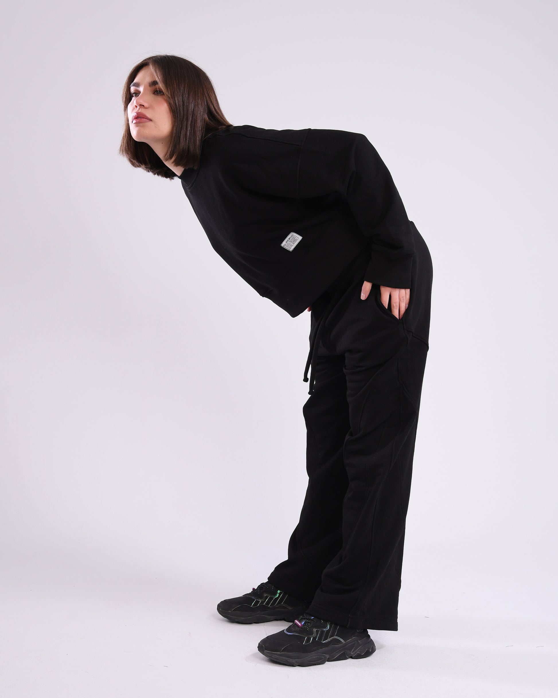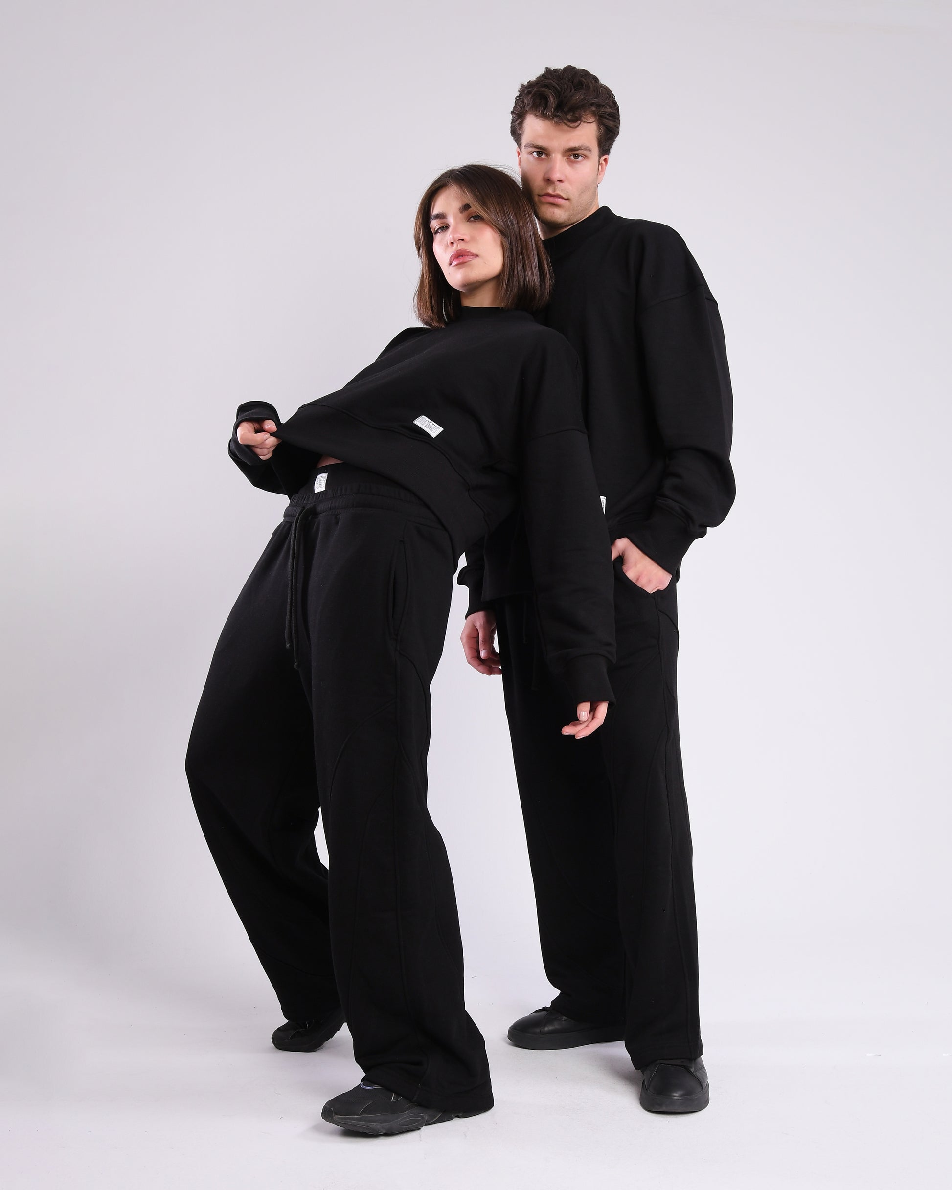 100% COTTON OVERSIZED FIT BLACK SWEATPANTS. CLOTH BRANDED PATCH KNITTED ON THE WAISTBAND. WITH 1 BACK POCKET, 2 FRONT POCKETS & A HIDDEN POCKET INSIDE. COMES WITH A 100% COTTON RELAXED FIT CREW IN BLACK. CLOTH BRANDED PATCH KNITTED AT THE BOTTOM LEFT.