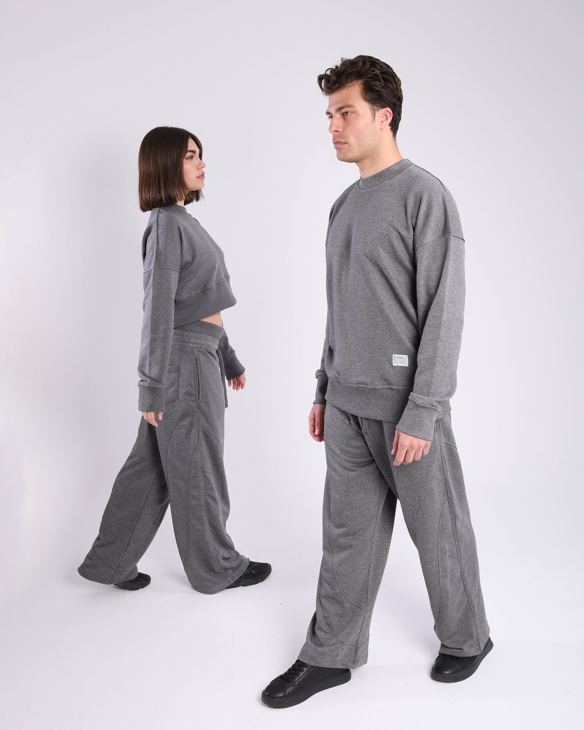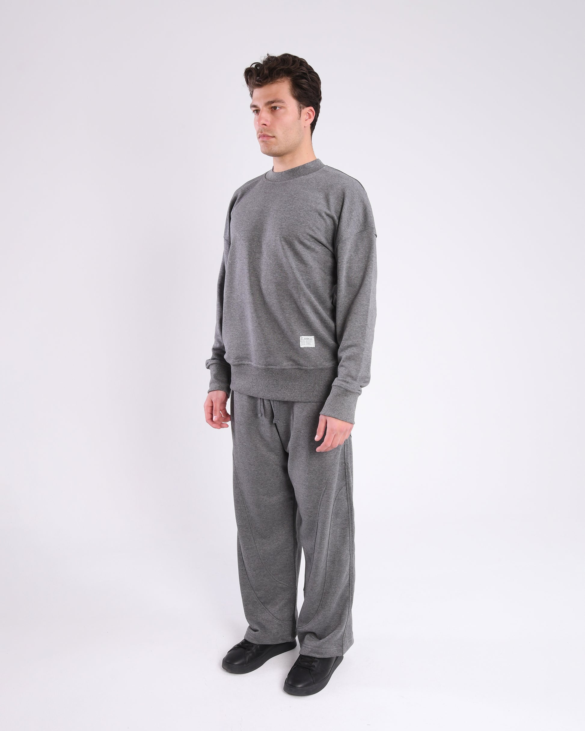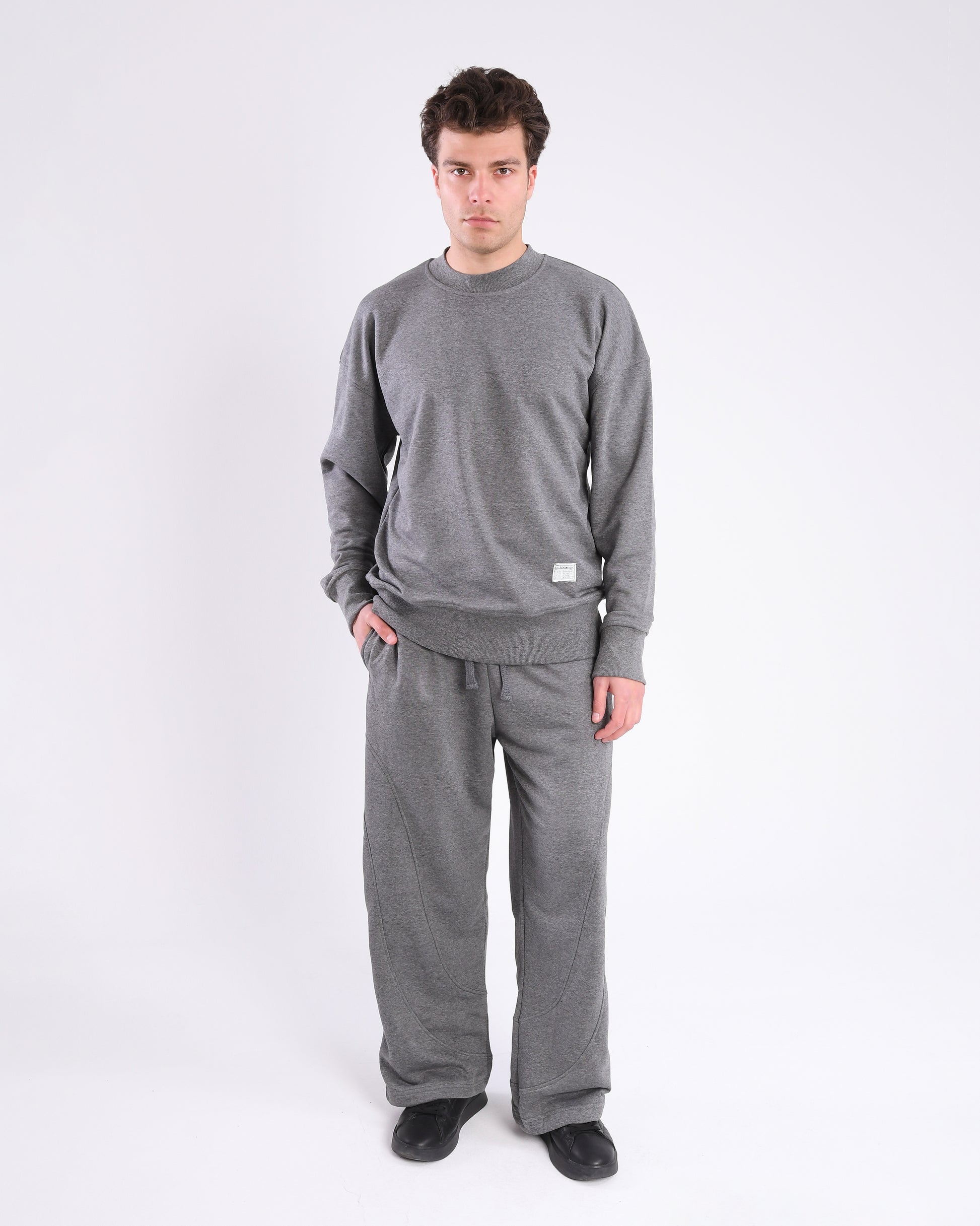 100% COTTON OVERSIZED FIT GREY SWEATPANTS. CLOTH BRANDED PATCH KNITTED ON THE WAISTBAND. WITH 1 BACK POCKET, 2 FRONT POCKETS & A HIDDEN POCKET INSIDE. COMES WITH A 100% COTTON RELAXED FIT CREW IN GREY. CLOTH BRANDED PATCH KNITTED AT THE BOTTOM LEFT.